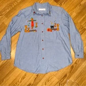 Karen Scott Chambray Halloween Button Up Shirt 100% Cotton Sz XL