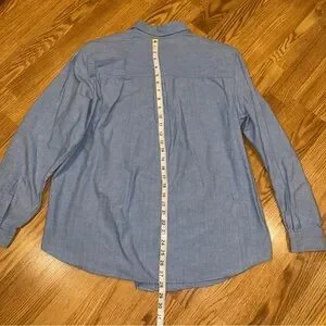 Karen Scott Chambray Halloween Button Up Shirt. 100% Cotton. Size tag is missing but appears to be a woman’s extra large; please confirm measurements show in photos. Has shoulder pads which could be easily cut out. Missing collar button. Top button is glued because shank snapped; see last photo. No stains.