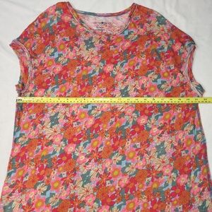 Vibrant floral short sleeve dress with a mix of colors. Features raw hems and edges and a relaxed, boxy fit. 100% cotton. Midi length. There are slits on both sides of the skirt. Measures 48 inches from shoulder to hem while laying flat. Pit to pit measures about 21.5 inches. Pre-owned and in good condition with no stains or holes.