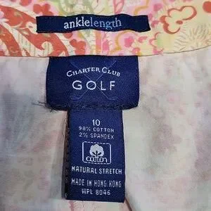 Charter Club Golf Size 10 Pistachio Green and Pink Paisley Ankle Length Pants. Excellent Used Condition, No Holes, Rips, Stains or Snags. Flat Front. Zipper Fly with Button Closure. Please refer to measurements in photos to ensure proper fit.