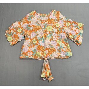 Democracy Floral V Neck Blouse Womens Medium Orange Boho Tie Hem Top