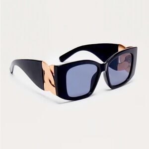 Black square framed plastic sunglasses with metallic gold temple detail. NEW