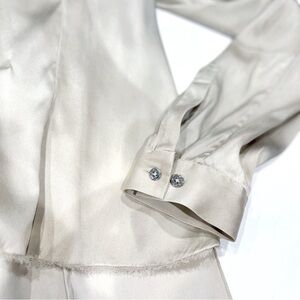 Sophisticated with a subtle edge, this silk blouse features a soft ivory base with a tonal abstract print for understated visual texture. The high-low hemline adds movement and a flattering drape, while the delicate fringe detail along the front hem gives the piece a modern, slightly edgy finish without losing its refined appeal. Designed in a fluid button-front silhouette, it transitions effortlessly from office to evening. Style it with tailored trousers for polished workwear or pair with denim and loafers for elevated everyday chic.