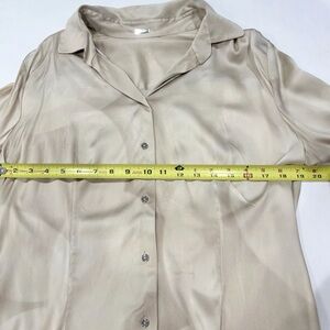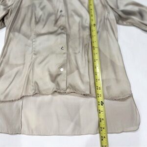 Features: Tonal abstract print, high-low hem, subtle fringe detail, button front, long sleeves