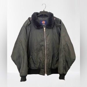 This coat checks all the boxes for buyers searching for vintage Dickies jackets, insulated bomber coats, fur-collar work jackets, cold-weather gear, and heavy-duty outerwear.