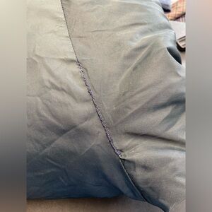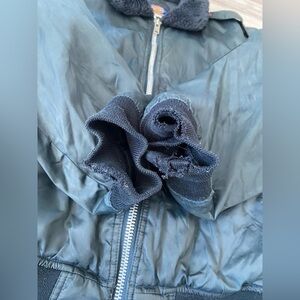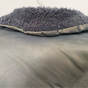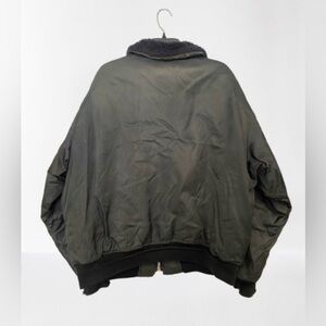 Please view all photos- discoloration at back neck area and near zipper -jacket has been cleaned. Sleeves- noted tearing at seams. Backside of right arm has been restitched. This was completed years ago. No sign of opening in area, the repair is complete and does not affect the warmth or staying away from elements. Small back stain.