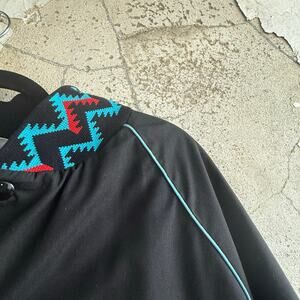 Vintage West Ark snap-front bomber, made in the USA. Black poly cotton shell with quilted nylon lining, raglan sleeves, and ribbed collar, cuffs, and hem in a teal red southwestern knit. Turquoise piping traces the shoulders, and the back features a large Sheyenne Valley Grain logo. A rugged, western-leaning bomber in hard-to-find 2XL.