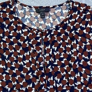 J Crew sleeveless top in a geometric print. This blouse features a pleated front and a round neckline with a subtle keyhole detail. The flattering silhouette makes it a versatile piece for various occasions.