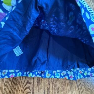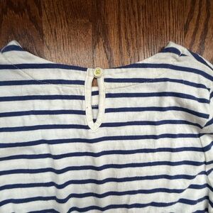 New without tags long sleeve dress. Top is knit with navy blue stripes on white. Skirt is a multi-colored rainbow cheetah print. Functional neon yellow tie waist. Lined. Patch pockets on either side of skirt. Button and keyhole on back. 100% cotton.