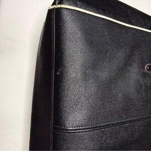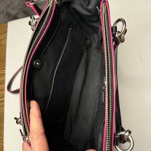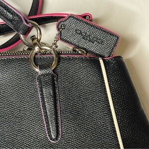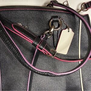 Quality Coach bag. Black cross grain leather. Detachable crossbody strap edged in pink to match piping in to edge of bag. Carry handles are edged in a more purple shade. Body and hang tag have white accents. Very sturdy bag with lots of pockets. A few minor callouts, please see photos for details. This is a great Coach Christie (small) in a unique colorway and really good pre-loved condition. Comes with the original hangtag.