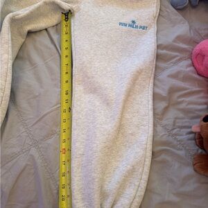 23 Inch inseam. Comfortable and stylish, these gray sweatpants from Pink Palm Puff are perfect for kids. Ideal for playtime or lounging, they offer a cozy fit with a trendy look. My daughter loved them…for when she wore them twice and then had a growth spurt