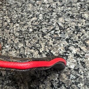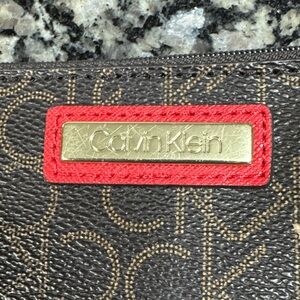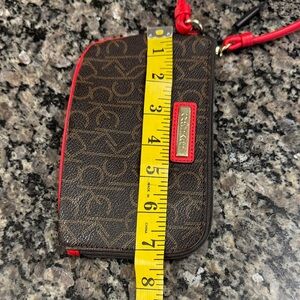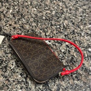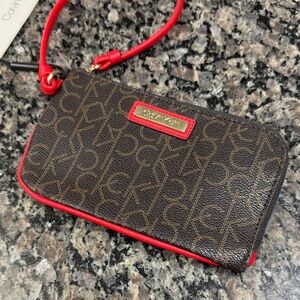 Chic Calvin Klein wristlet with bold red trim. Iconic logo design.
