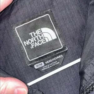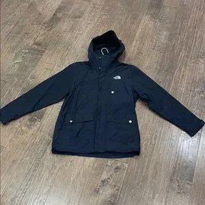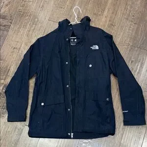 Black hooded jacket with zip and snap closure. Features The North Face logo on chest. Includes front pockets.