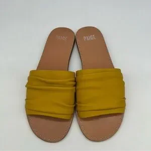 PAIGE Emilia Leather Slide Sandals Mustard Yellow Ruched Band Womens 8.5 US