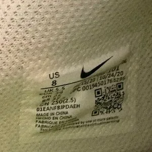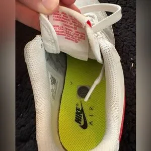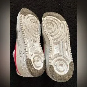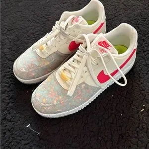 Stylish Nike sneakers with a vibrant pink swoosh. White base with colorful accents. Perfect for casual wear.