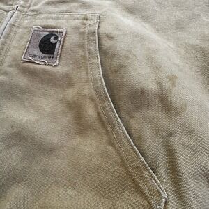 Up for sale is a classic Carhartt work coat in a beautiful beige color. This vintage jacket features a sturdy cotton canvas outer shell, with a quilted nylon lining and polyester insulation to keep you warm. The jacket is hooded, has a button closure, and is designed for regular fit.