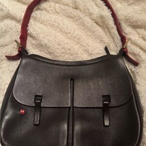 Italian made leather shoulder bag with a deep brown body. Features bold red strap. Unique snap latch closure front messenger bag styled pockets