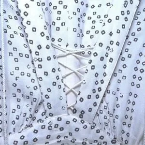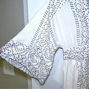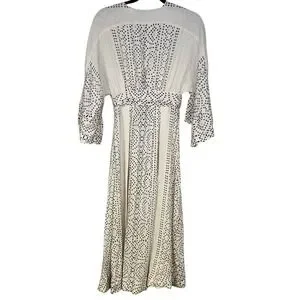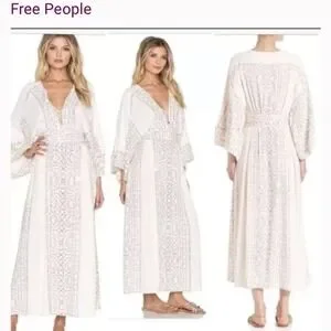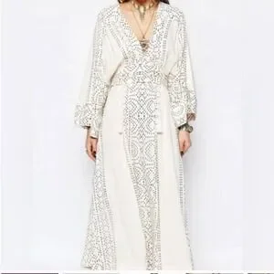 Excellent condition Free People white maxi Kimono style dress adorned with intricate geometric shapes. This flowing silhouette features a deep V-neckline with a delicate lace-up detail, cinched waist with decorative tassels, and Flowy sleeves. Perfect for a beach vacation, music festival, or a relaxed bohemian-inspired daytime look.