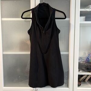 Chic black mini dress with a zip-front design. Sleeveless and stylish. Built in shorts w pockets. Ideal for versatile wear. Pet & Smoke Free environment.