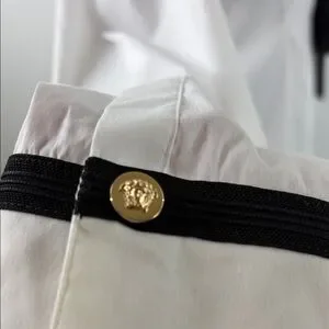 Elegant white button down shirt. Features black and gold accents. Perfect for formal occasions.