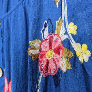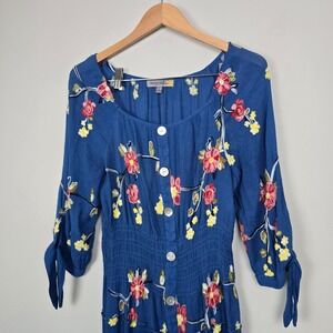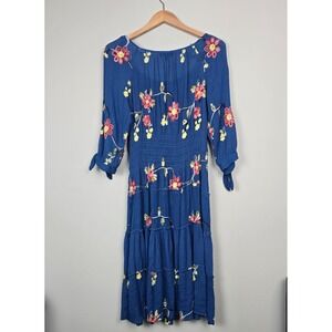 Elegant blue maxi dress with vibrant floral patterns. Perfect for any occasion.