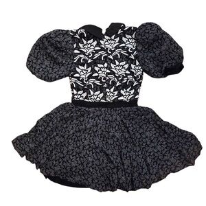 Elegant black dress with white floral patterns. Puff sleeves and fitted waist. Perfect for any occasion.