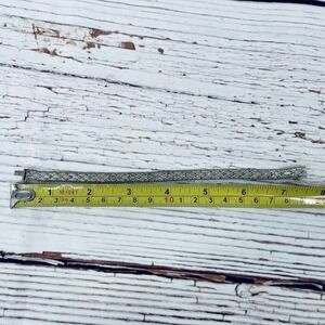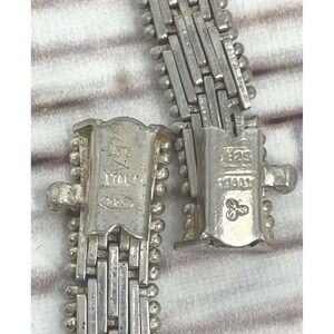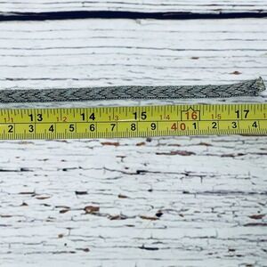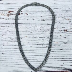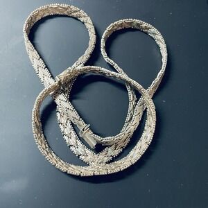 This Italian-made 925 sterling silver jewelry set includes a 17-inch V-shaped necklace and a 7.5-inch bracelet, both featuring a woven design and measuring 7mm in width and 50g in weight. The set is signed by the maker and is of vintage style. Made in Italy, the set is crafted with high-quality materials and has a timeless appeal suitable for unisex adults. Perfect for those who appreciate fine jewelry with a touch of elegance and authenticity. Preowned matching set.