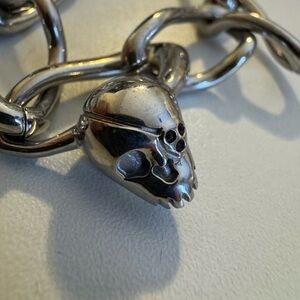 Bold silver bracelet with skull charm. Chunky chain design. Perfect for edgy style.