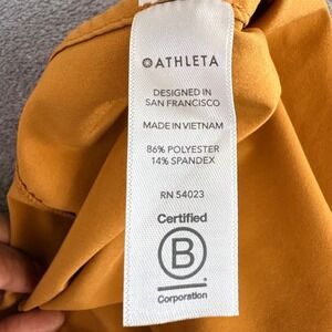 ATHLETA Marlow Tuscan Gold V-Neck Lightweight Dress Romper. This stylish one-piece features a flattering wrap-style bodice and a comfortable tie waist for a comfy fit. Functional side pockets offer practicality, and the shorts silhouette makes it a versatile addition to your wardrobe. The design includes short, cap sleeves for added interest.