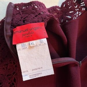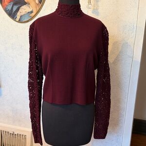 Made in Italy sleeves crochet and neck zips from top to bottom arm pit to arm pit 20 in a back and front has 2 seams to hug abdomen area shoulder to hem 18.5 in color is wine it should only be dry cleaned