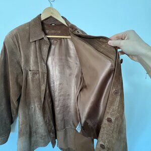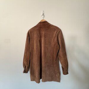 Authentic 1990s vintage suede jacket crafted from genuine suede leather with a polyester lining for comfort. Designed in a button-down shirt jacket (overshirt) silhouette with classic western / cowgirl influence. Soft, supple suede in a rich brown tone with structured seams and a relaxed, easy fit.
