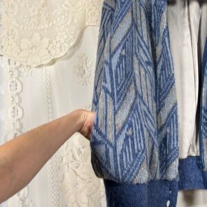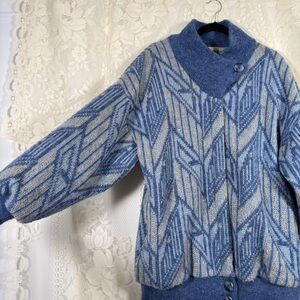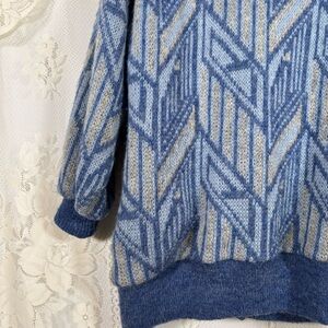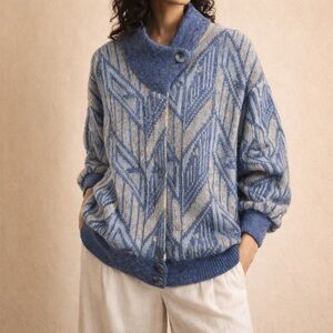 Dreamy vintage 100% wool knit cardigan in blue + cream geometric knit with a cozy shawl collar and statement buttons. Soft, warm, and perfectly slouchy—so cute layered over a tee with denim or dressed up with a skirt. Made in Canada with genuine Scandinavian yarn.