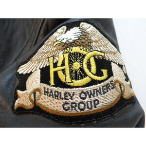 Women's leather jacket featuring embroidered patches and detailed stitching.