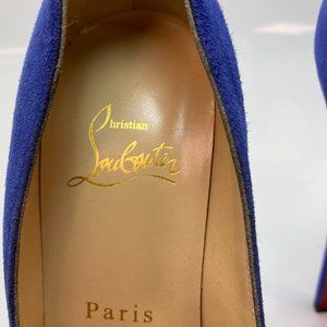 Elegant blue suede heels. Signature red sole. High platform design.small discoloration spot on one of the heels