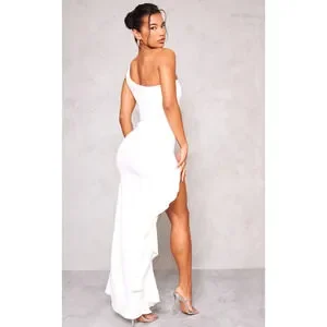 Elevate your summer wardrobe with this stunning PrettyLittleThing White Maxi Ruffle High Slit Dress in a size XS. This brand new, never worn dress features a beautiful white color that is perfect for any occasion.