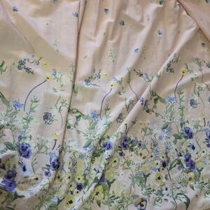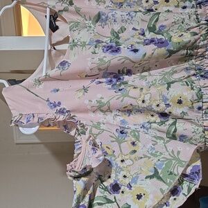 Charming dress with a cream background. Adorned with blue and green floral designs. Perfect for weddings. Waist is stretchy, and lenght from shoulders is 54 inches.