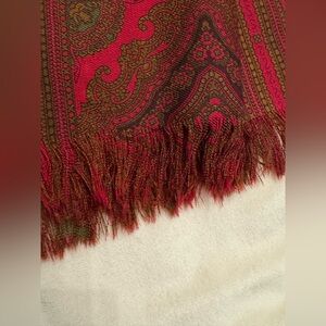 Vibrant wool scarf with intricate red and green patterns. Crafted for style and warmth.