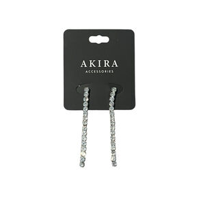 The AKIRA Chandelier Drop Earrings are a stunning accessory featuring 2.5-inch Cubic Zirconia diamonds studded in surgical steel. The earrings are designed with a long hook/ear wire closure, making them perfect for various occasions like Christmas, weddings, anniversaries, christenings, and confirmation/communion. The clear white/colorless Cubic Zirconia stones are simulated and clarity enhanced, adding a touch of beauty to any outfit. These earrings are nickel-free and signed by the brand Akira, offering a stylish and elegant look for the modern woman.