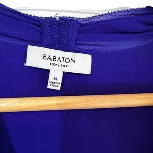 This is a Babaton silk semi sheer ruffle front sleeveless blouse. It’s a flowy log blouse with a rounded hem. Looks good tucked in or out. It’s a size medium and in excellent condition