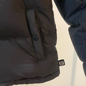 Stylish black puffer jacket with a hood. Perfect for cold weather.