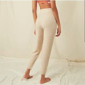 These cream track pants by Free People offer a relaxed fit with a high-rise waistband and tapered legs, perfect for casual outings or lounging at home. Crafted from a soft material, they provide both comfort and style in a versatile design.