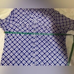 Chic button down shirt with a bold blue and white pattern. Ideal for casual or formal settings. Adds a touch of elegance to any outfit.