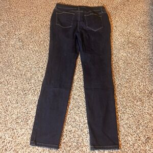 Dark wash straight leg jeans from Chico's. Classic five-pocket styling with a comfortable mid-rise fit. Versatile for everyday wear or dressing up for a casual evening out.