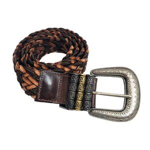 VINTAGE Streets Ahead Woven Leather Mixed Metal Belt 39" Brown Silver Gold Tone --- Mixed media, woven style, distressed, vintage, heavy metal hardware buckle, western boho