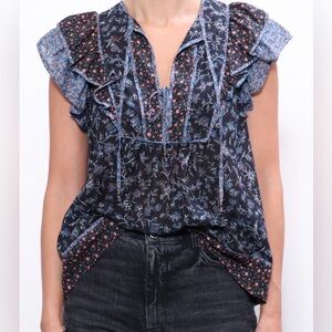 Like new! The Cora Top is a signature Ulla Johnson silhouette. Crafted from their season favorite floral patchwork cotton viscose fabrication. Sleeveless silhouette featuring split neckline with double bows, flowy shape, and ruffle sleeve detailing. Contrast piping adds a graphic element.