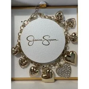 Jessica Simpson Gold Tone Heart Charm Bracelet Sparkle Rhinestone