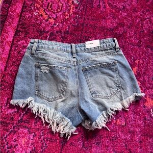 Trendy distressed jean shorts. Frayed hem adds style. Perfect for casual wear.