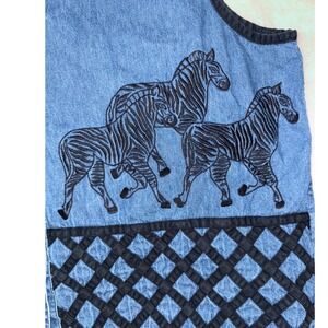 Tantrums vintage denim vest showcasing a playful zebra embroidery across the front and a single striking zebra on the back. This sleeveless piece features a classic collared neckline and a button-up front. The hem is accented with a quilted diamond pattern trim.