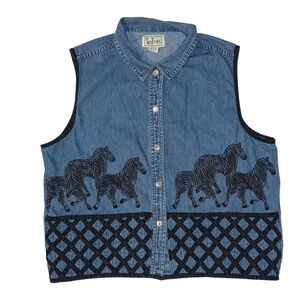 Tantrums Vintage Denim Zebra Embroidered Button Front Vest Womens 1X Blue Cotton