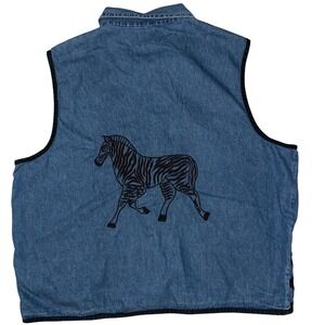 Keywords: denim vest, zebra print, embroidered, sleeveless, button front, collared, plus size, animal print, quilted trim, casual wear, statement piece, unique design, western style, boho chic